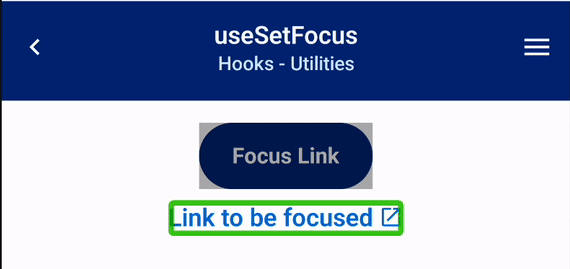 return ( <> <Button onPress={() => { return setFocus(myRef); }} > Focus Link </Button> <Link href="google.com" ref={myRef}> Link to be focused </Link> </>);Example